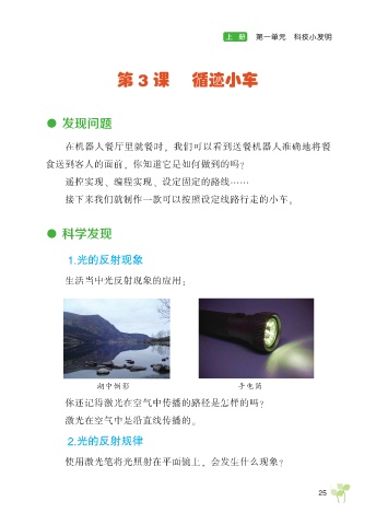 上 册 第一单元 科技小发明 第 3 课 循迹小车 ● 发现问题 在机器人餐厅里就餐时, 我们可以看到送餐机器人准确地将餐 食送到客人的面前, 你知道它是如何做到的吗? 遥控实现、 编程实现、 设定固定的路线…… 接下来我们就制作一款可以按照设定线路行走的小车。 ● 科学发现 1.光的反射现象 生活当中光反射现象的应用: 湖中倒影 手电筒 你还记得激光在空气中传播的路径是怎样的吗? 激光在空气中是沿直线传播的。 2.光的反射规律 使用激光笔将光照射在平面镜上, 会发生什么现象? 25