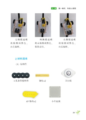 上 册 第一单元 科技小发明 左 侧 循 迹 模 两 侧 循 迹 模 右 侧 循 迹 模 块 检 测 到 黑 色 , 块未检测到黑色, 块 检 测 到 黑 色 , 向左偏转。 保持直行。 向右偏转。 2.材料清单 (1) 结构件 4 孔条形塑料件 铜柱×2 万向轮 45°角码×2 小车底板 29