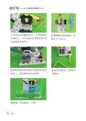 智 创 未 来 — ——中小学创意发明教程 四年级 ⑦ 用 M3×8 的螺丝将另一个角码固定 ⑧用铁轴连接泡泡轮, 安 在铜柱上, 再用 M3×30 的螺丝将 TT 装在 TT 马达上。 马达固定在角码上。 ⑨将驱动模块和电源开关模块安装在 ⑩连 接 电 源 线 与 电 源 开 底座上, 并连接相应的电源线。 关模块。 做好啦! 快来测试一下吧! 92